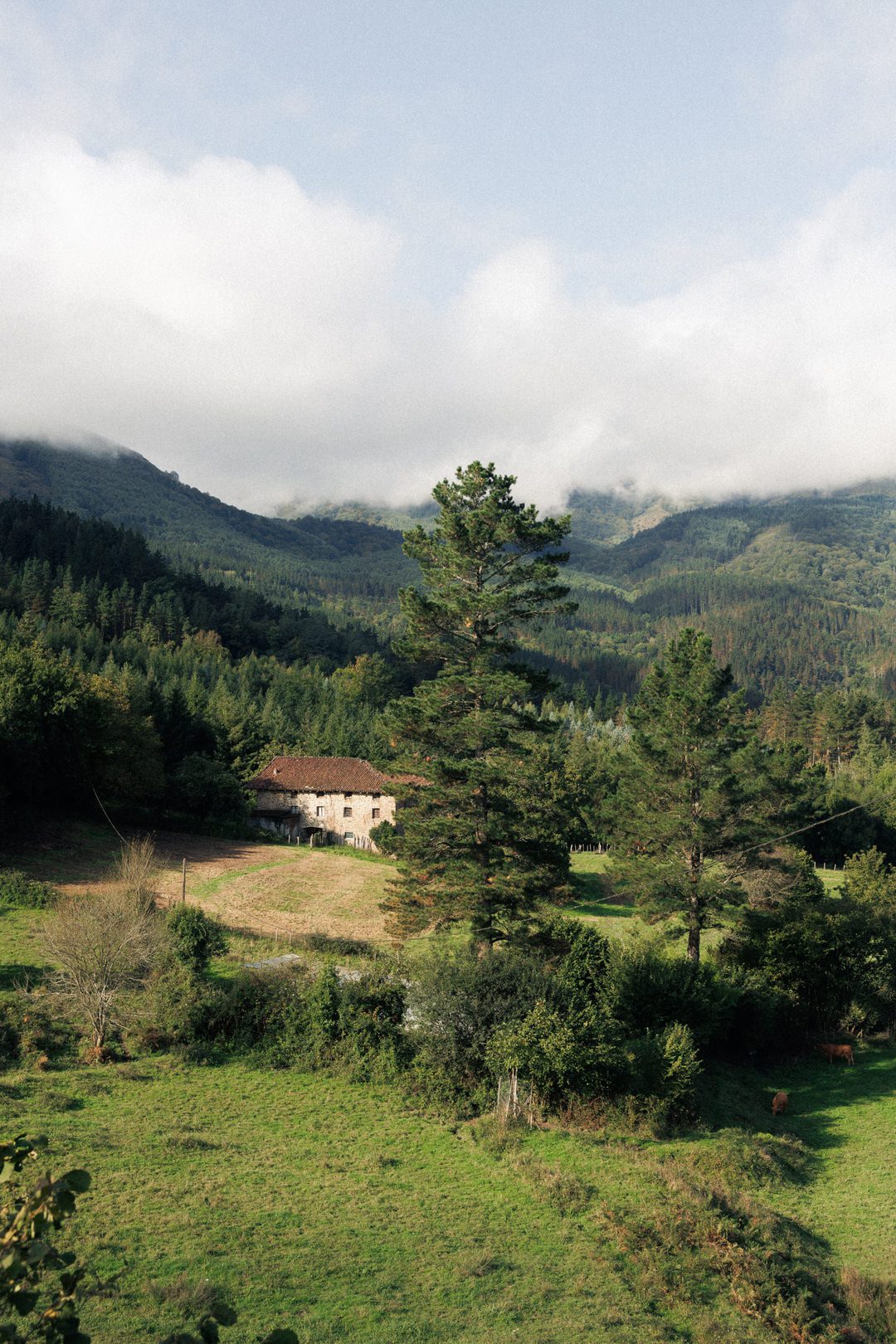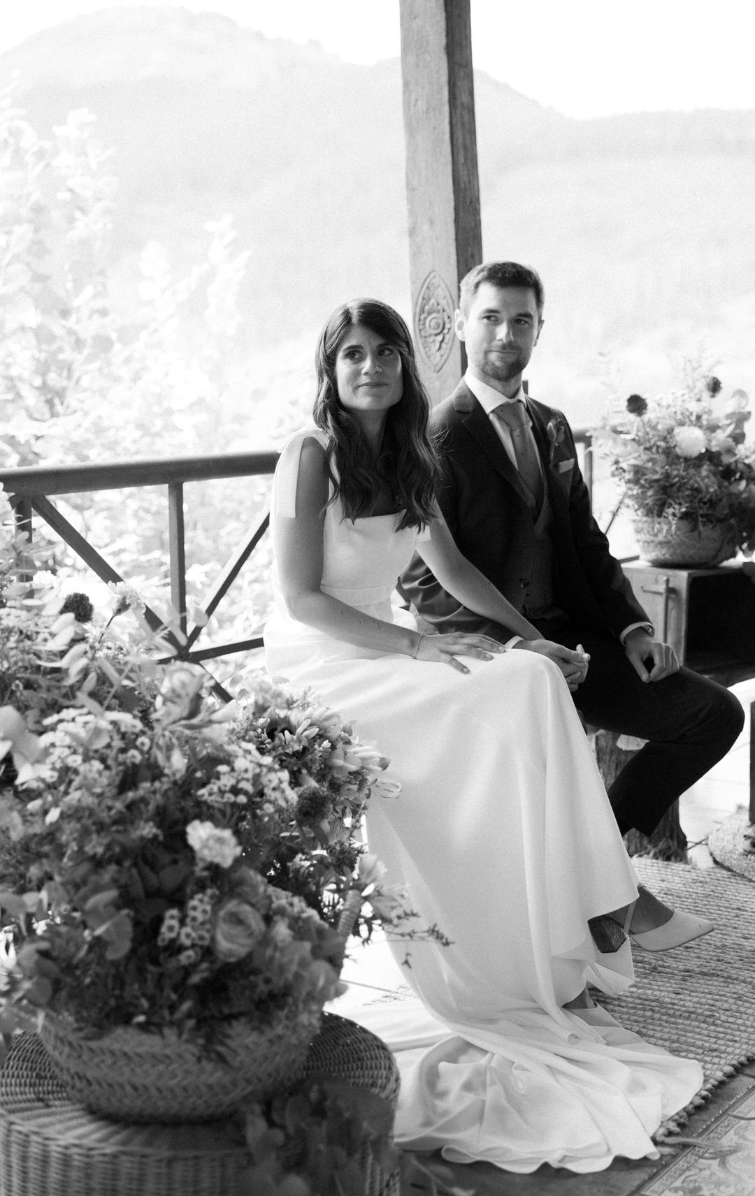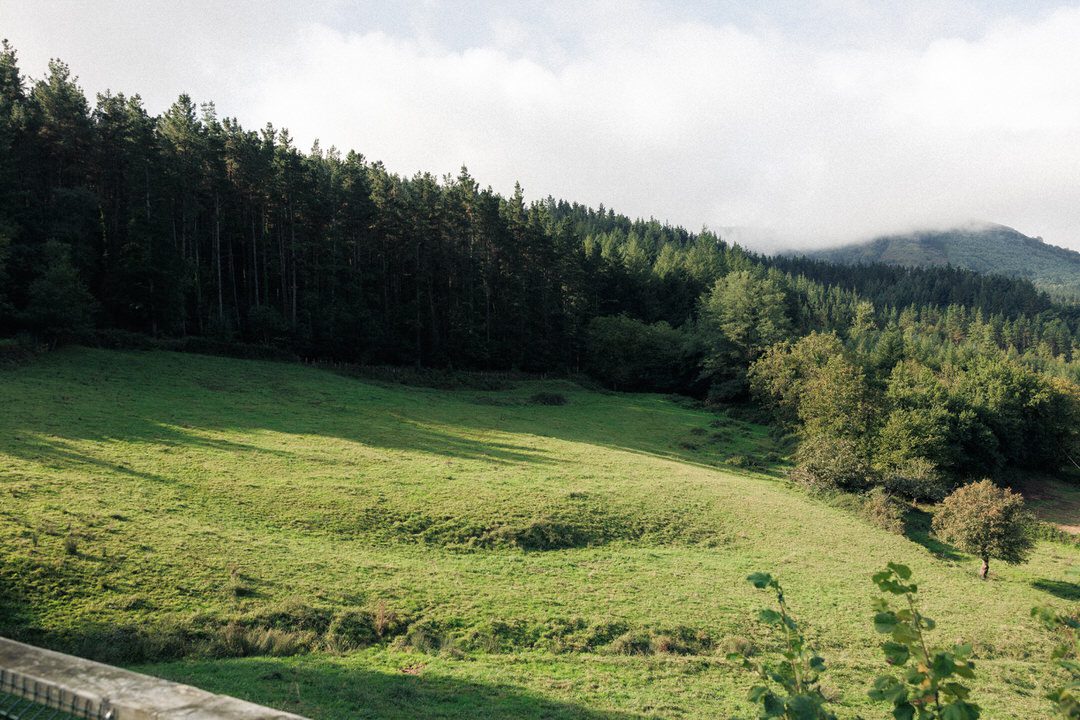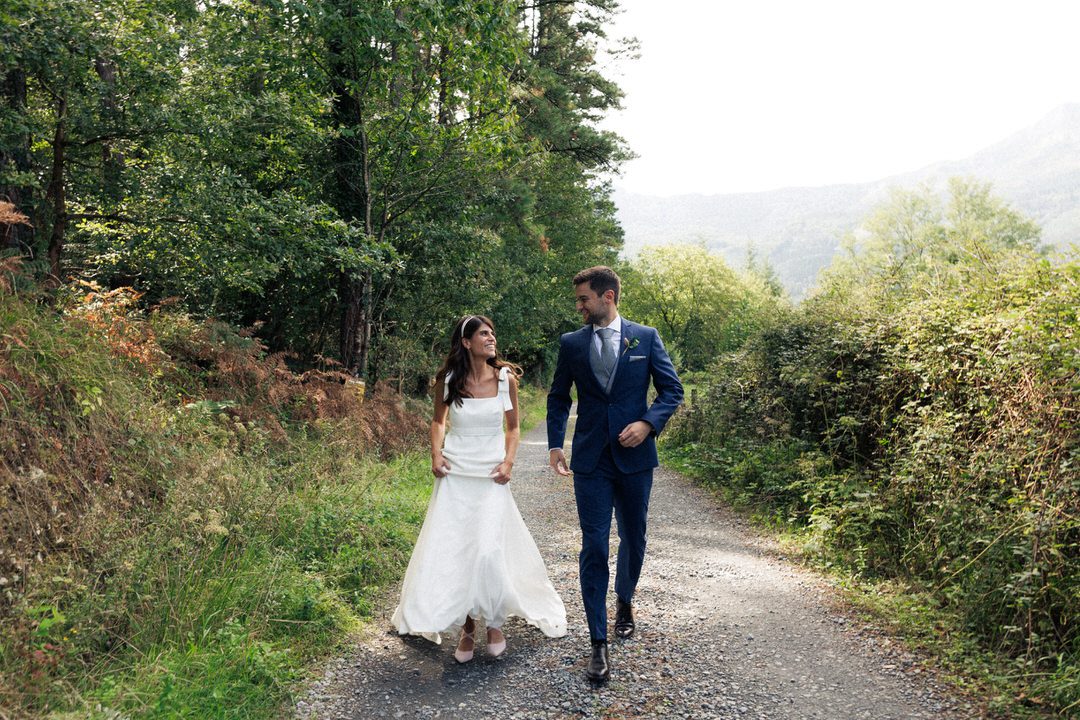 Tras la ceremonia, mientras los invitados disfrutaban del cóctel, aprovechamos los exteriores del Hotel Spa Etxegana para realizar un pequeño reportaje de pareja. Sus alrededores ofrecen paisajes verdes, rincones con encanto y la tranquilidad perfecta para obtener fotografías que reflejan la conexión y la complicidad entre Andrea y Mikel.